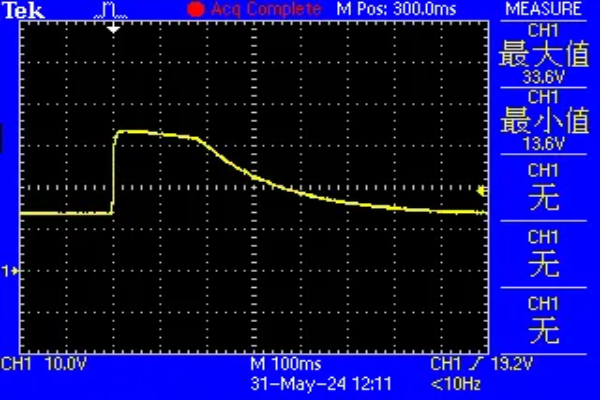 SM8S系列产品满足ISO 7637-2的测试标准,可以及时吸收尖峰电压并将电压稳定在安全范围内。图为SM8S24CA根据ISO7637-2标准中5A脉冲所测得的Vc波形图。